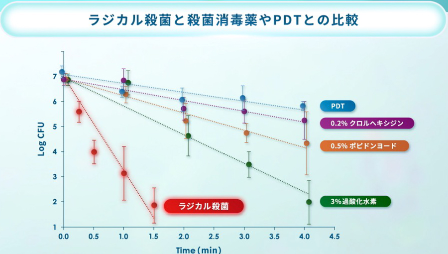 ラジカル(活性酸素)は、細胞壁を酸化する強い反応性を持ちながら、青色光が消えると瞬時に失活するため、組織への残留ダメージがありません。