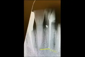 根管治療中に破折したファイルが根管内に放置されている場合も従来は、マイクロスコープと超音波でとるしかありませんでしたが、レーザーによる水の微小爆発を利用して、破折ファイルを除去すると今まで以上に成功率が上がります。